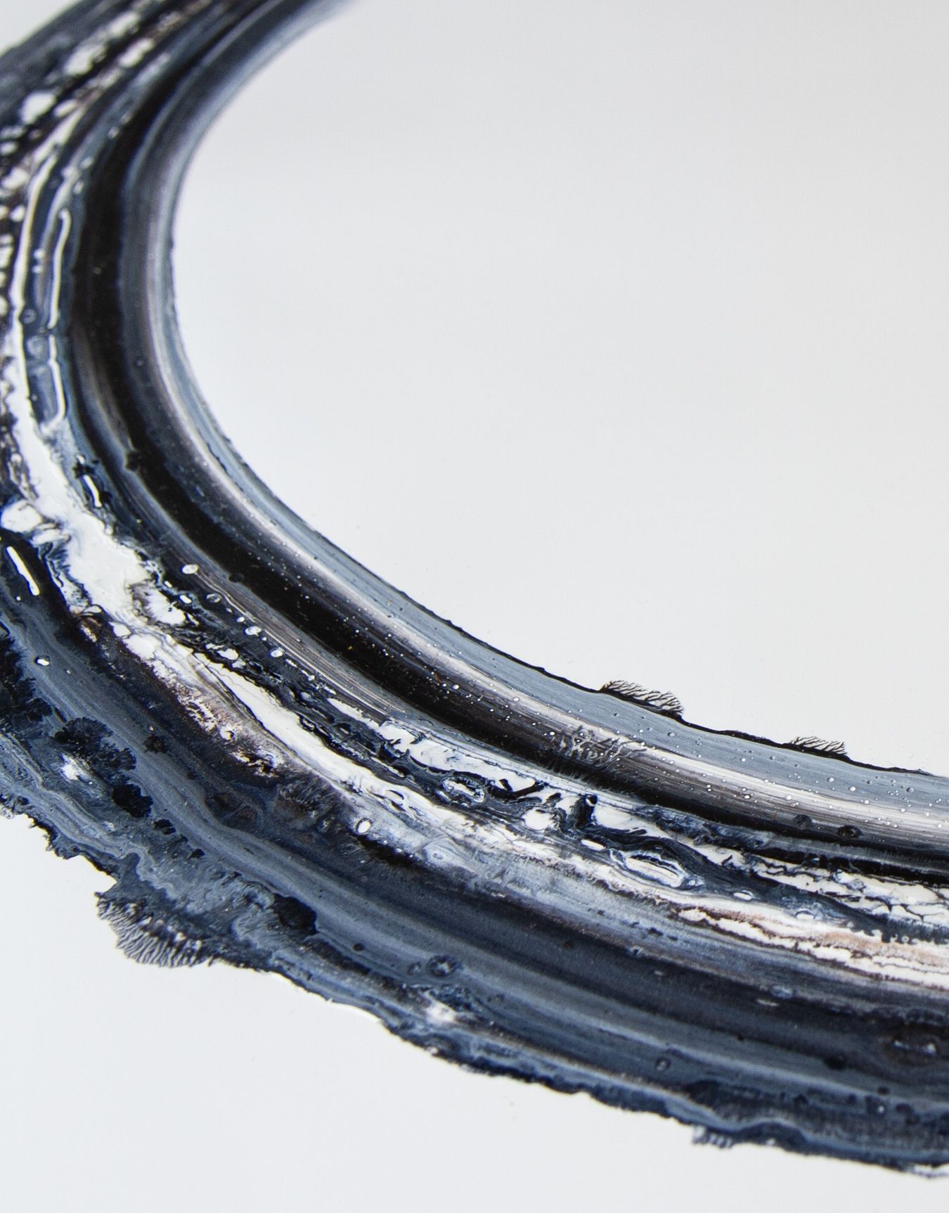 The constant movement of the paper as the paint is applied gives the work a sense of motion, the process creates irregularities, distorted layers and faded color gradients. There is sense of movement and freedom yet this irregularity is bound by the formality of the circle.