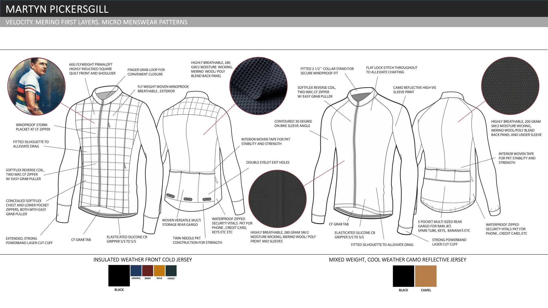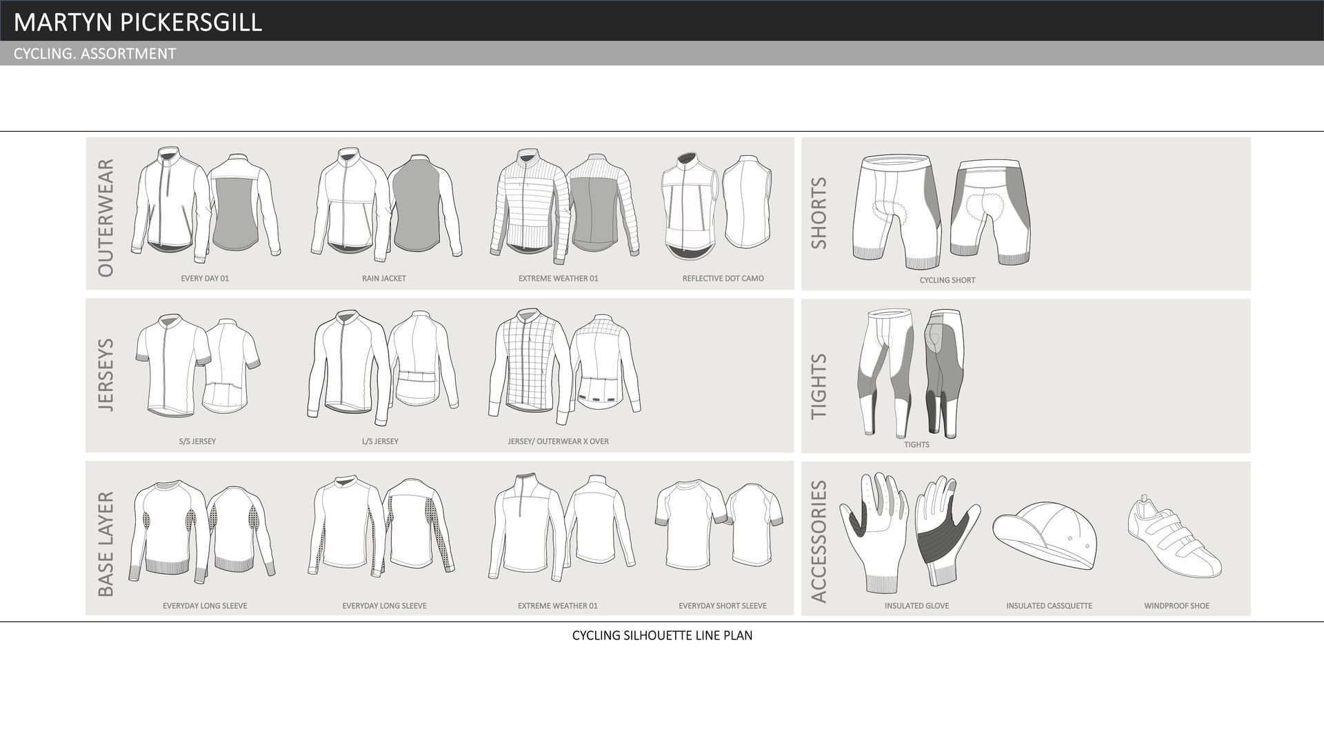 A SMALL, VERSATILE COLLECTION OF THE MOST IMPORTANT CORE GARMENTS THAT WILL BE NEEDED BY ANY CYCLIST. THE COLLECTION IS EXCEPTIONALLY FUNCTIONAL BOTH IN DESIGN AND FABRICATION. IT COMBINES SPECIFIC CYCLING SILHOUETTES WITH NATURAL AND MAN MADE FABRICS TO PROVIDE AN ASSORTMENT OF GREAT LAYERING PIECES THAT ENSURE RIDER COMFORT IN A VARIETY OF (OFTEN BAD) WEATHER CONDITIONS.